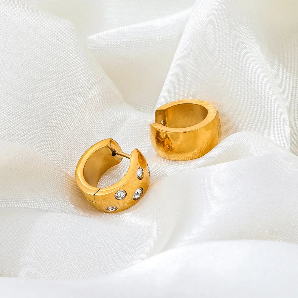 Elegant, bright and delicately modern — the Lumière Zircon Hoop Earrings bring a refined touch of luxury to any look. Designed in high-quality stainless steel and plated with 18K gold, these hoops feature a sleek geometric silhouette adorned with brilliant zircon stones set with precision.