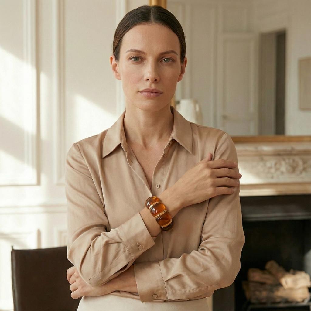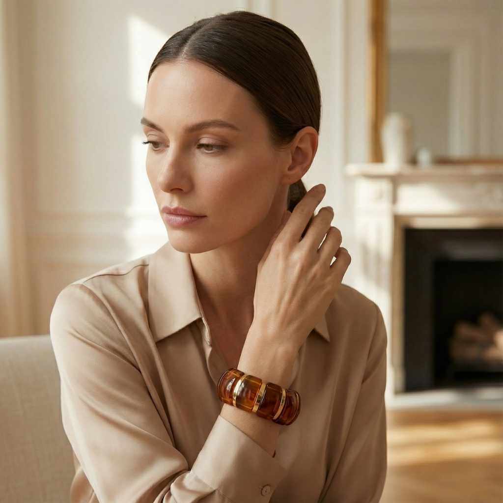 A wide, continuous bracelet with a strong presence and smooth lines.